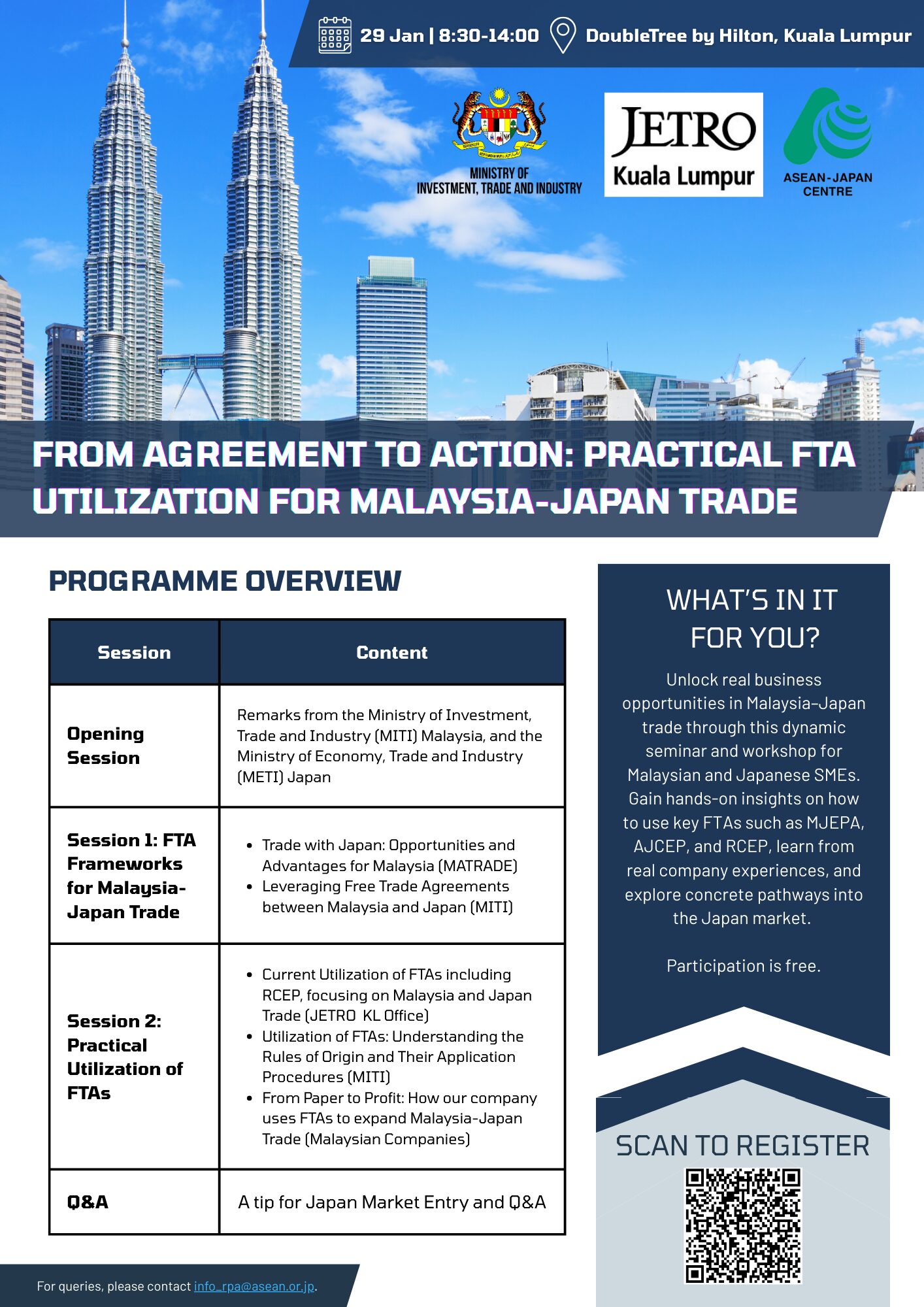 The ASEAN–Japan Centre (AJC), in collaboration with the Ministry of Investment, Trade and Industry (MITI) Malaysia and JETRO Kuala Lumpur, will host an FTA Promotion Seminar titled “From Agreement to Action: Practical FTA Utilization for Malaysia–Japan Trade.” The seminar targets Malaysian and Japanese export-oriented SMEs seeking to strengthen their practical use of Free Trade Agreements (FTAs) in bilateral trade.