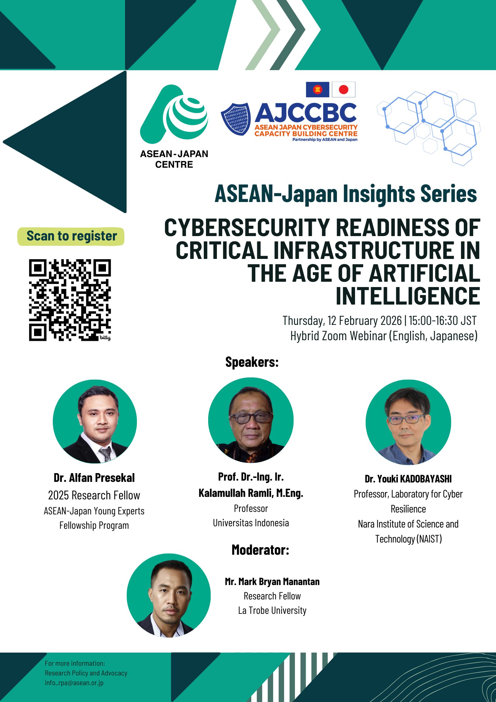 The webinar will draw on ongoing ASEAN–Japan cooperation to discuss policy alignment, AI-enabled threat intelligence, cybersecurity governance, and regional capacity building. It will highlight emerging risks to critical infrastructure, including cyberattacks on energy systems and supply chains, while also examining how AI-driven tools can enhance detection, response, and resilience. The session will also feature the ASEAN-Japan Young Experts Research Fellow presenting his findings on cybersecurity readiness in the age of AI, drawing on case studies from the ASEAN Member States, with particular attention to Indonesia. By bringing together research insights and practitioner perspectives from academia, government, and industry, the webinar aims to identify practical pathways for strengthening cybersecurity readiness and advancing regional cooperation in the age of AI.