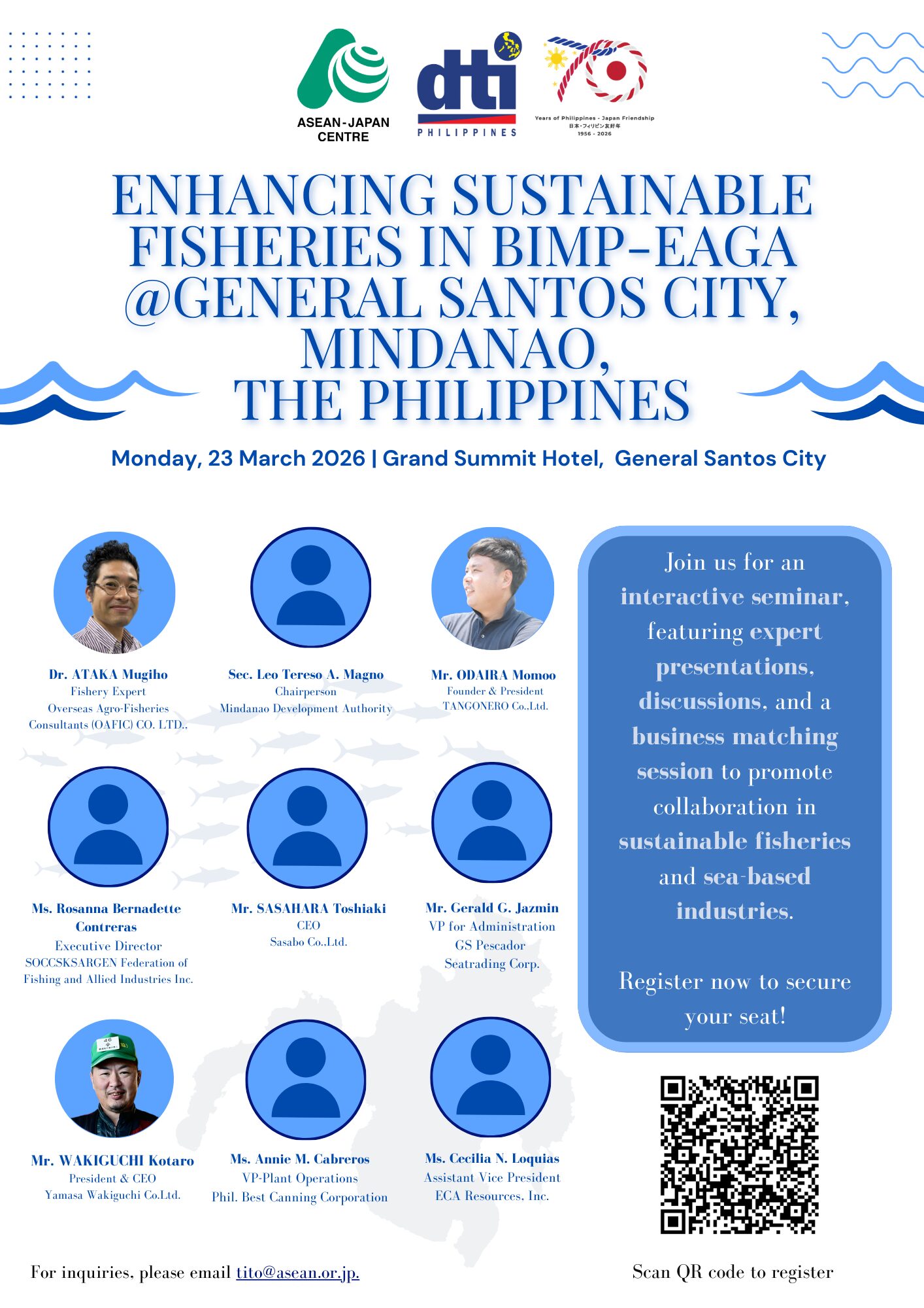 The ASEAN-Japan Centre (AJC), in cooperation with the Department of Trade and Industry (DTI) Headquarters and DTI Region XII, will host an interactive seminar titled “Enhancing Sustainable Fisheries in BIMP-EAGA @General Santos City, Mindanao, the Philippines” on 23 March 2026 at the Grand Summit Hotel, General Santos City. The seminar is in commemoration of the Philippines-Japan Friendship Year (70th Anniversary of Normalization of Diplomatic Relations), bringing together businesses, experts, and public sector representatives from Japan and the Philippines to strengthen cooperation in sustainable fisheries and sea-based industries.