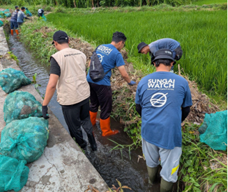 At 08:00 AM, participants and members of the Sungai Watch community gathered at the site for a technical briefing prior to the cleanup. The session outlined the scope of work, which focused on a 100-meter stretch of the river, and highlighted the river’s critical role in the local irrigation system. Participants were reminded that accumulated waste not only degrades the river ecosystem but also poses a risk of contaminating nearby rice fields, reinforcing the importance of proper waste removal.