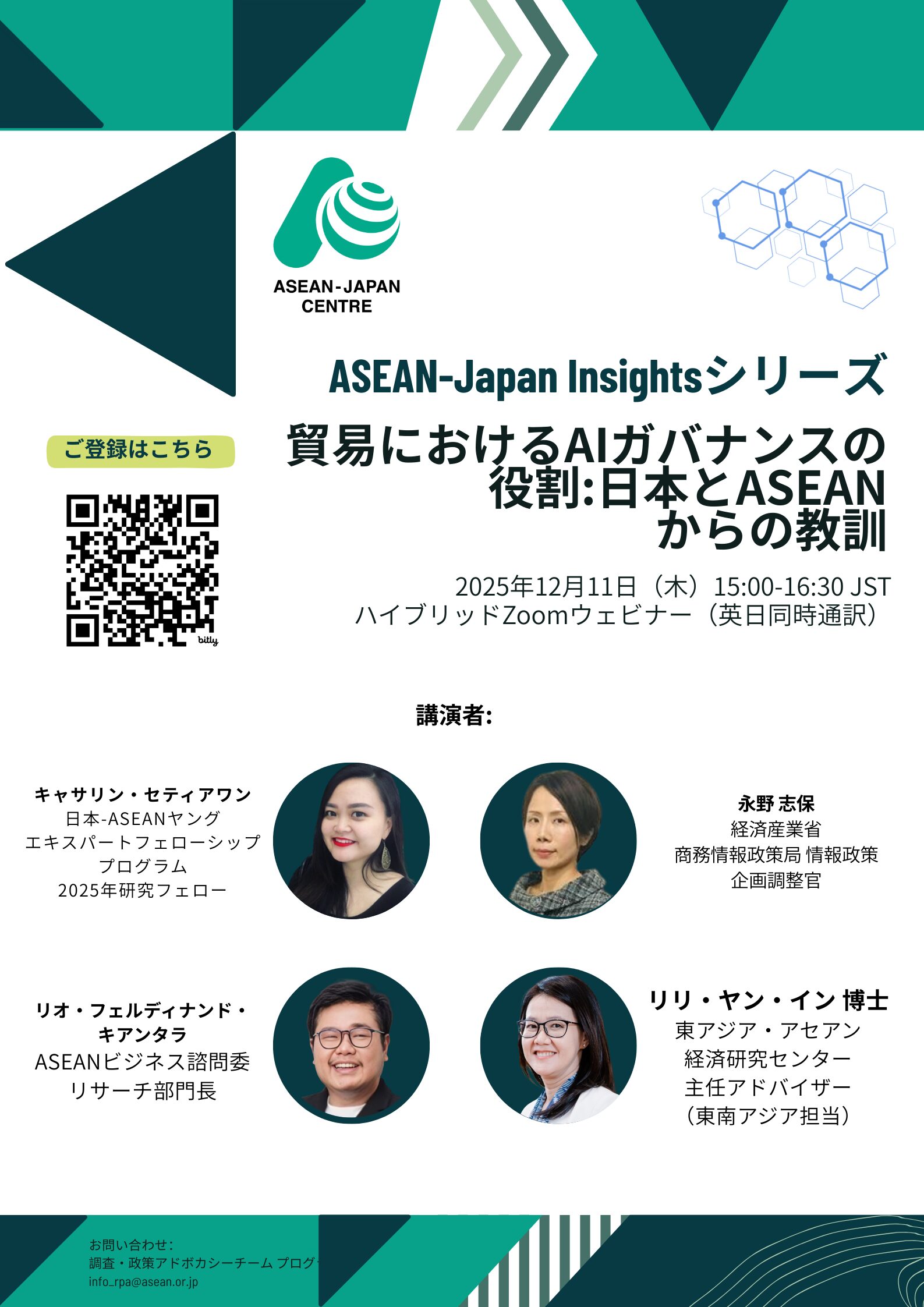多様で成長著しいデジタル経済を有するASEANは、政策の調和という課題に直面しています。一方、日本は倫理性・国際協調を重視した成熟したAI政策の枠組みを構築しており、両地域は相互に学び合い、将来に向けた協力の可能性を持っています。本ウェビナーでは、ASEANと日本がどのように協力し、貿易を支えるAIガバナンスの強化に向けて共通の道筋を描けるかを議論します。