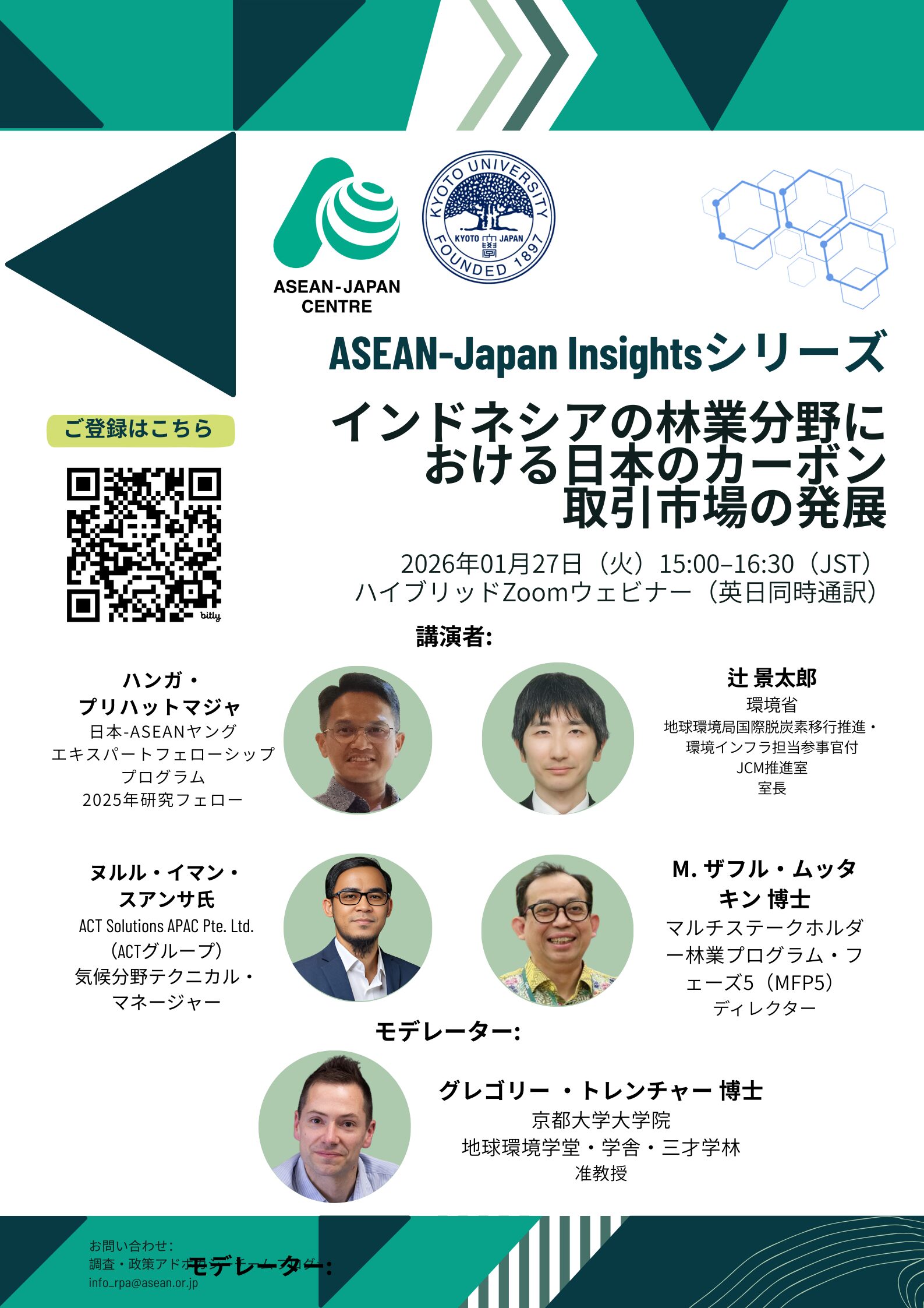 京都大学ASEAN拠点との共催により、本ウェビナー「インドネシアの林業分野における日本のカーボン取引市場の発展」では、日本とインドネシアがネットゼロ目標の達成に向けて、森林由来のカーボン市場をどのように推進しているかを取り上げます。政策枠組み、市場メカニズム、モニタリング・報告・検証(MRV)基準など、日本が培ってきた透明性と信頼性の高いカーボン取引制度の経験を紹介し、インドネシアのFOLU Net Sink 2030プログラムの下で拡大する森林由来カーボン取引への示唆を探ります。
